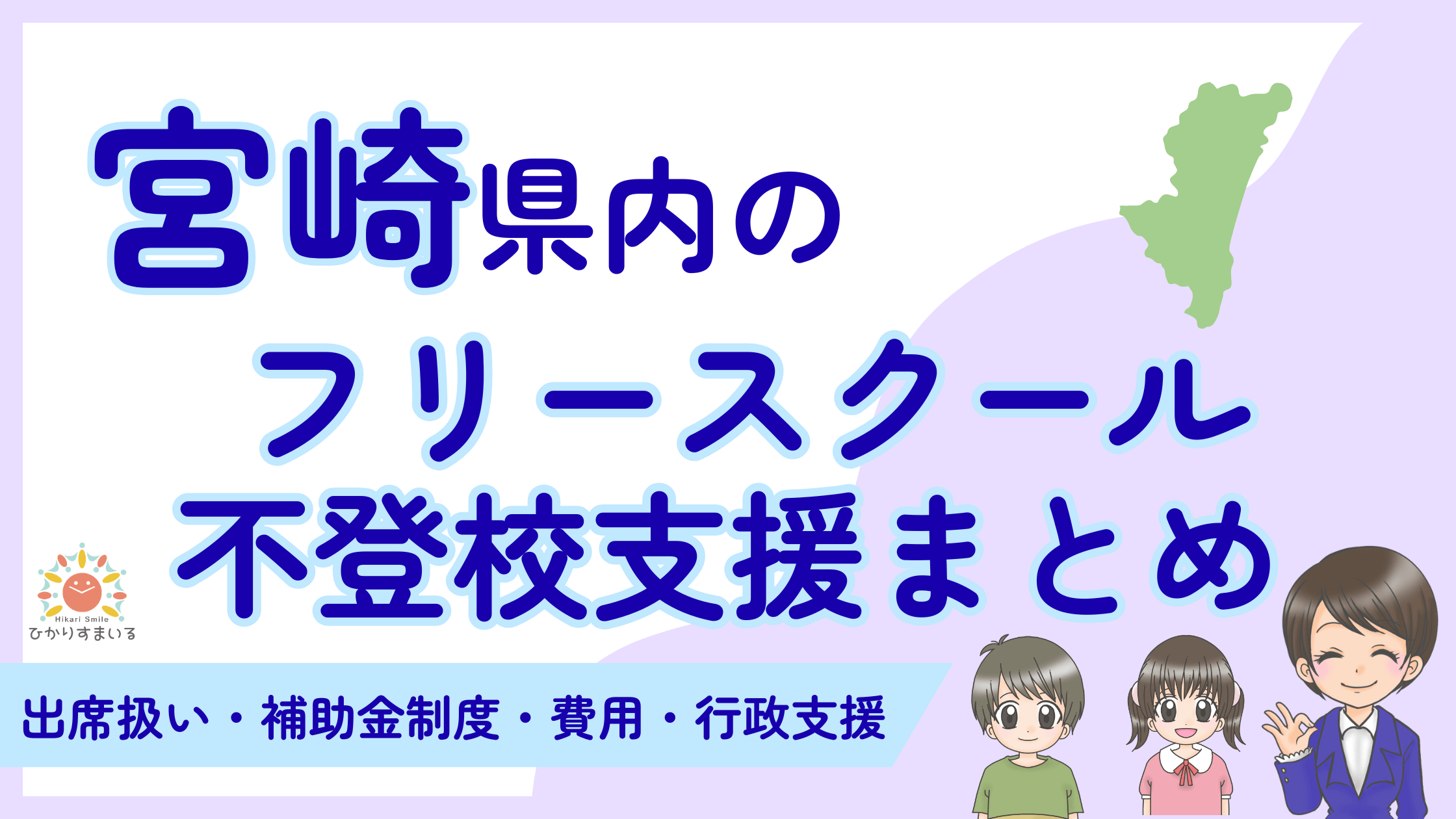補助金制度は未整備ですが、フリースクールへの通学を学校の出席として認める「出席扱い」の実績は、宮崎市、都城市、延岡市、えびの市で確認されています。