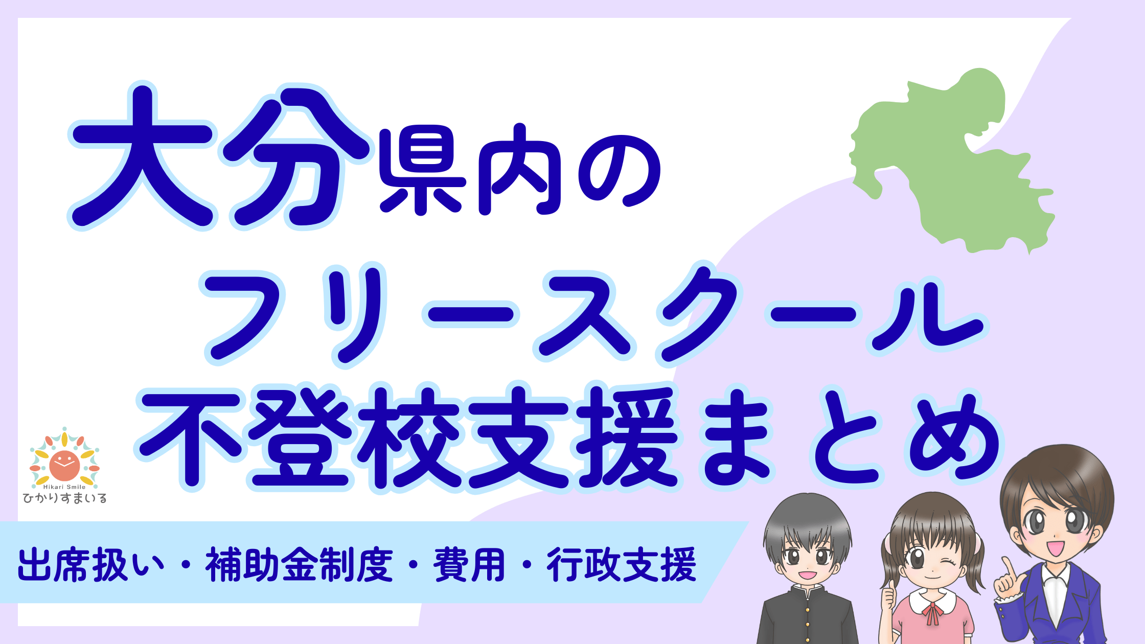 補助金制度は未整備ですが、フリースクールへの通学を学校の出席として認める「出席扱い」の実績は、大分市、佐伯市、国東市、宇佐市で確認されています。
