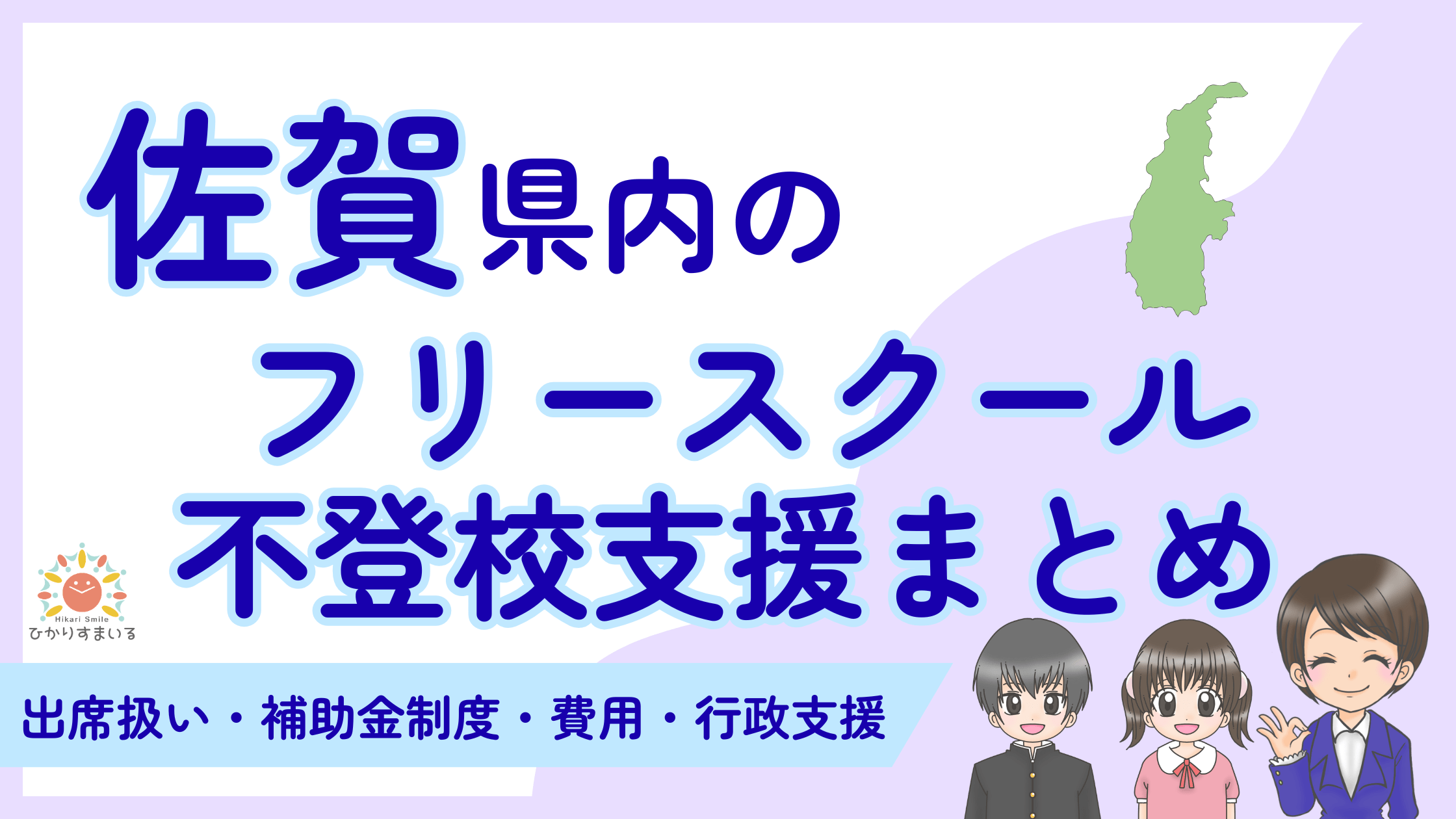 補助金制度は未整備ですが、フリースクールへの通学を学校の出席として認める「出席扱い」の実績は、佐賀市、鳥栖市、伊万里市、武雄市、神埼市で確認されています。