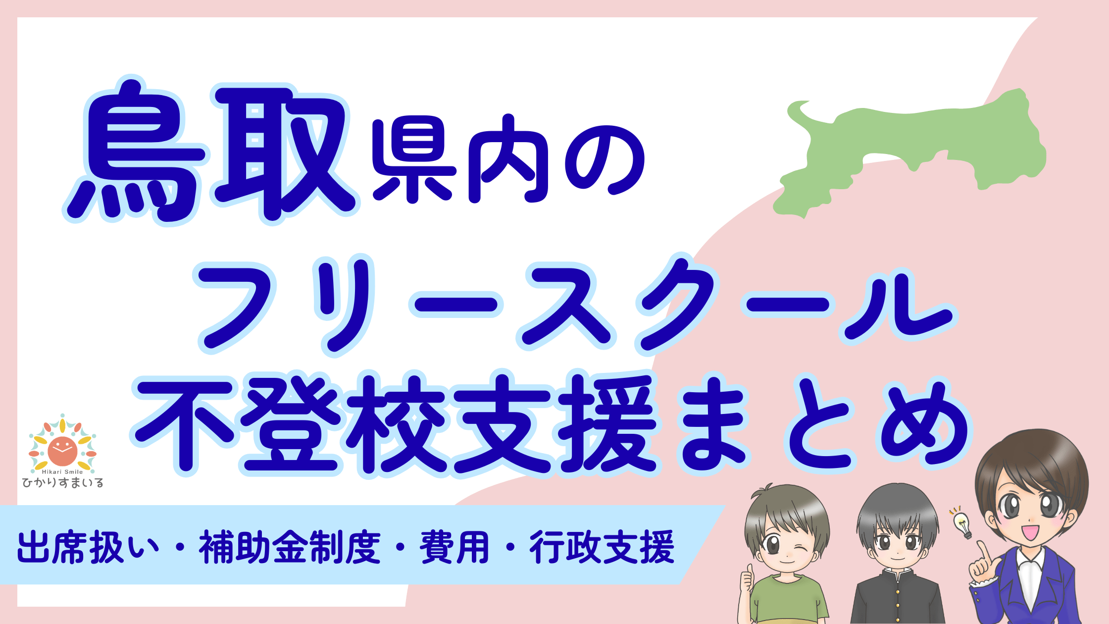 補助金制度は未整備ですが、フリースクールへの通学を学校の出席として認める「出席扱い」の実績は、鳥取市、倉吉市、境港市で確認されています。